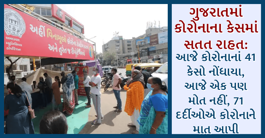 ગુજરાતમાં કોરોનાના કેસમાં સતત રાહત: આજે કોરોનાનાં 41 કેસો નોંધાયા, આજે એક પણ મોત નહીં, 71 દર્દીઓએ કોરોનાને માત આપી