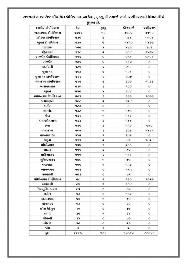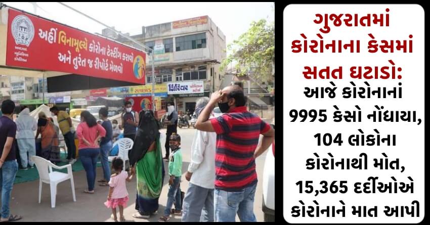 ગુજરાતમાં કોરોનાના કેસમાં સતત ઘટાડો: છેલ્લા 24 કલાકમાં કોરોનાનાં 9995 કેસો નોંધાયા, 104 લોકોના કોરોનાથી મોત, 15,365 દર્દીઓએ કોરોનાને માત આપી