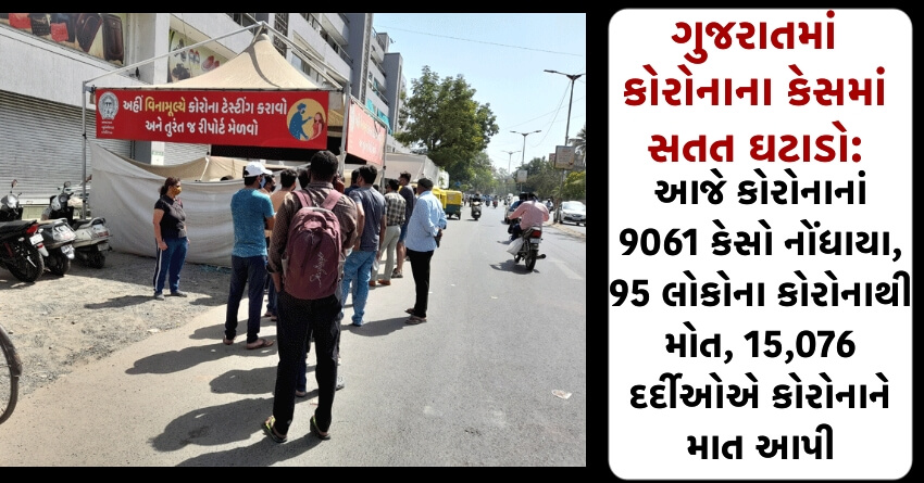ગુજરાતમાં કોરોનાના કેસમાં સતત ઘટાડો: છેલ્લા 24 કલાકમાં કોરોનાનાં 9061 કેસો નોંધાયા, 95 લોકોના કોરોનાથી મોત, 15,076 દર્દીઓએ કોરોનાને માત આપી