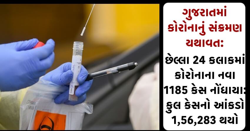 ગુજરાતમાં કોરોનાનું સંક્રમણ યથાવત: છેલ્લા 24 કલાકમાં કોરોનાના નવા 1185 કેસ નોંધાયા: કુલ કેસનો આંકડો 1,56,283 થયો