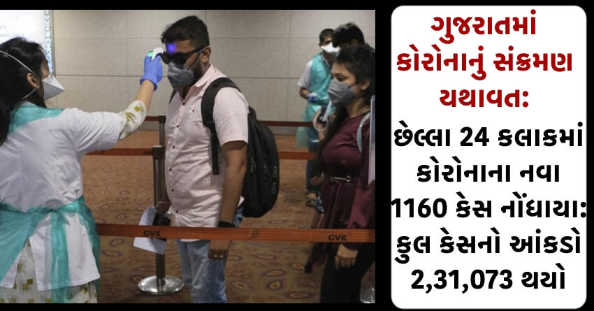 ગુજરાતમાં કોરોનાનું સંક્રમણ યથાવત: છેલ્લા 24 કલાકમાં કોરોનાના નવા 1160 કેસ નોંધાયા: કુલ કેસનો આંકડો 2,31,073 થયો