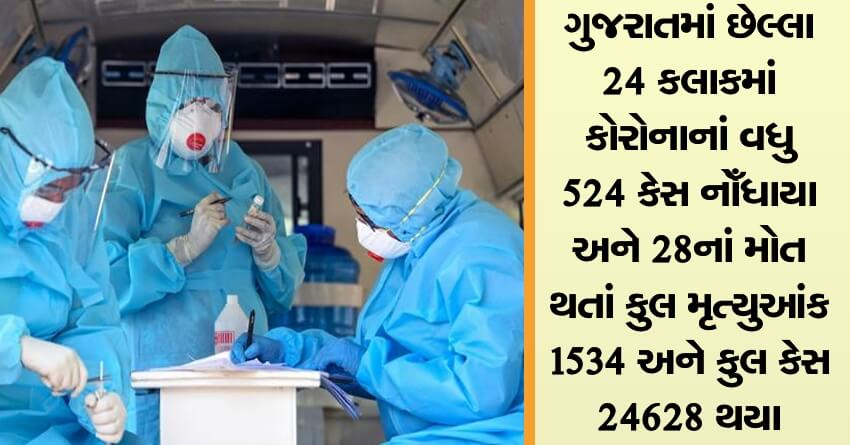 ગુજરાતમાં છેલ્લા 24 કલાકમાં કોરોનાનાં વધુ 524 કેસ નોઁધાયા અને 28નાં મોત થતાં કુલ મૃત્યુઆંક 1534 અને કુલ કેસ 24628 થયા