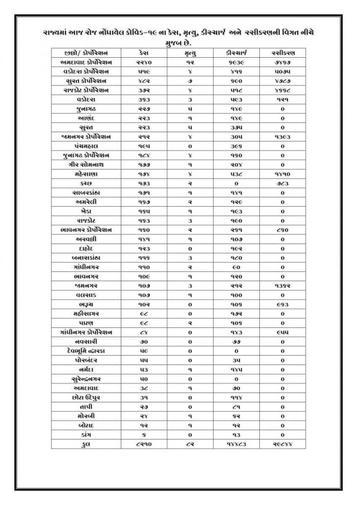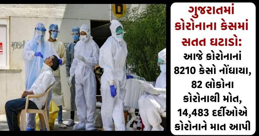 ગુજરાતમાં કોરોનાના કેસમાં સતત ઘટાડો: છેલ્લા 24 કલાકમાં કોરોનાનાં 8210 કેસો નોંધાયા, 82 લોકોના કોરોનાથી મોત, 14,483 દર્દીઓએ કોરોનાને માત આપી