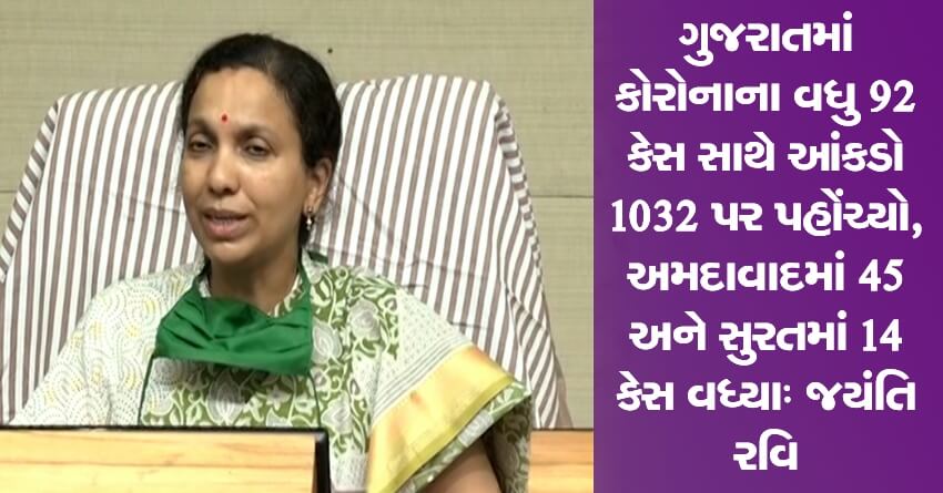 ગુજરાતમાં કોરોનાના વધુ 92 કેસ સાથે આંકડો 1032 પર પહોંચ્યો, અમદાવાદમાં 45 અને સુરતમાં 14 કેસ વધ્યાઃ જયંતિ રવિ