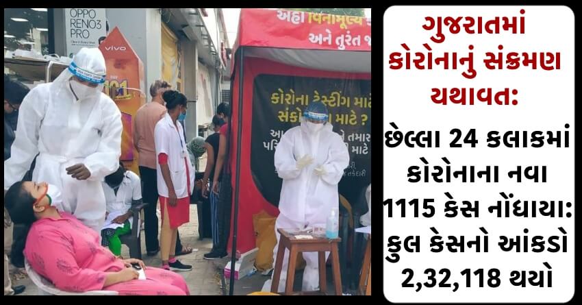ગુજરાતમાં કોરોનાનું સંક્રમણ યથાવત: છેલ્લા 24 કલાકમાં કોરોનાના નવા 1115 કેસ નોંધાયા: કુલ કેસનો આંકડો 2,32,118 થયો