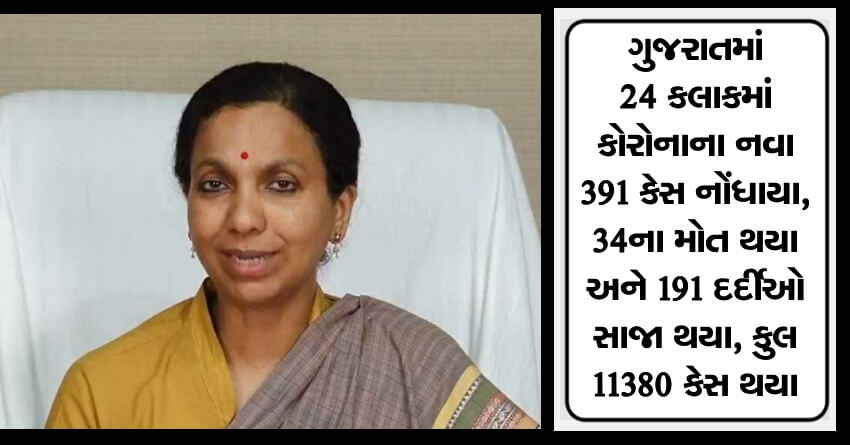 ગુજરાતમાં 24 કલાકમાં કોરોનાના નવા 391 કેસ નોંધાયા, 34ના મોત થયા અને 191 દર્દીઓ સાજા થયા, કુલ 11380 કેસ થયા