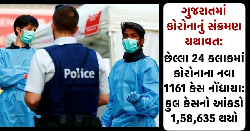 ગુજરાતમાં કોરોનાનું સંક્રમણ યથાવત: છેલ્લા 24 કલાકમાં કોરોનાના નવા 1161 કેસ નોંધાયા: કુલ કેસનો આંકડો 1,58,635 થયો
