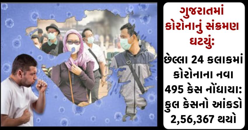 ગુજરાતમાં કોરોનાનું સંક્રમણ ઘટયું: છેલ્લા 24 કલાકમાં કોરોનાના નવા 495 કેસ નોંધાયા: કુલ કેસનો આંકડો 2,56,367 થયો