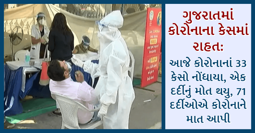 ગુજરાતમાં કોરોનાના કેસમાં રાહત: આજે કોરોનાનાં 33 કેસો નોંધાયા, એક દર્દીનું મોત થયુ, 71 દર્દીઓએ કોરોનાને માત આપી