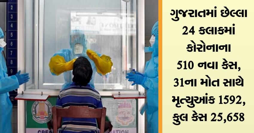 ગુજરાતમાં છેલ્લા 24 કલાકમાં કોરોનાના 510 નવા કેસ, 31ના મોત સાથે મૃત્યુઆંક 1592, કુલ કેસ 25,658 થયા