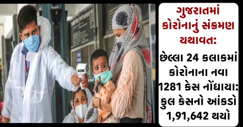 ગુજરાતમાં કોરોનાનું સંક્રમણ યથાવત: છેલ્લા 24 કલાકમાં કોરોનાના નવા 1281 કેસ નોંધાયા: કુલ કેસનો આંકડો 1,91,642 થયો