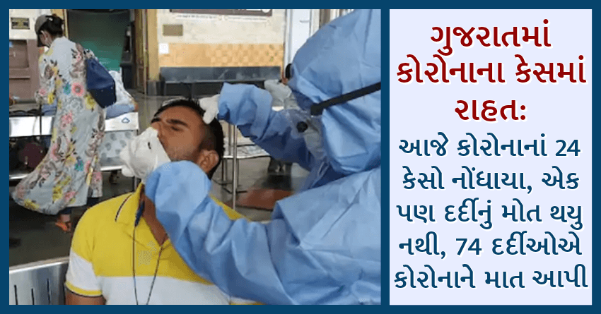 ગુજરાતમાં કોરોનાના કેસમાં રાહત: આજે કોરોનાનાં 24 કેસો નોંધાયા, એક પણ દર્દીનું મોત થયુ નથી, 74 દર્દીઓએ કોરોનાને માત આપી