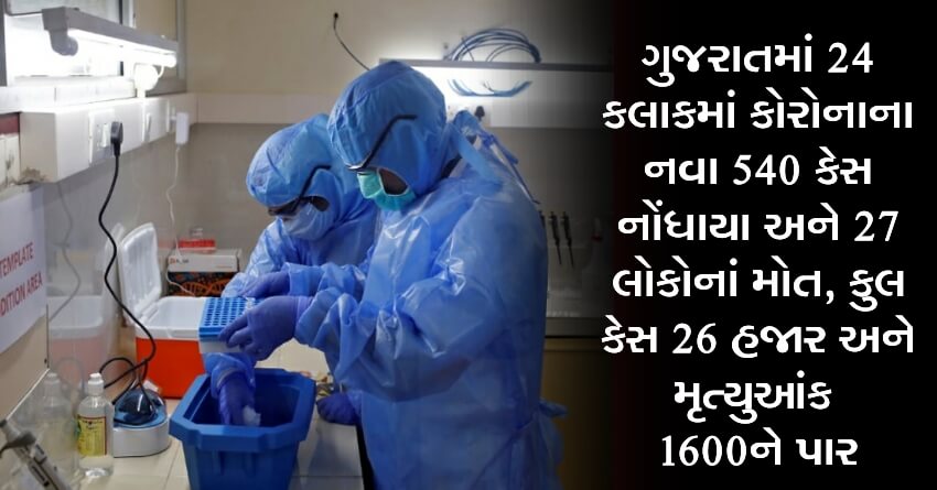 ગુજરાતમાં 24 કલાકમાં કોરોનાના નવા 540 કેસ નોંધાયા અને 27 લોકોનાં મોત, કુલ કેસ 26 હજાર અને મૃત્યુઆંક 1600ને પાર