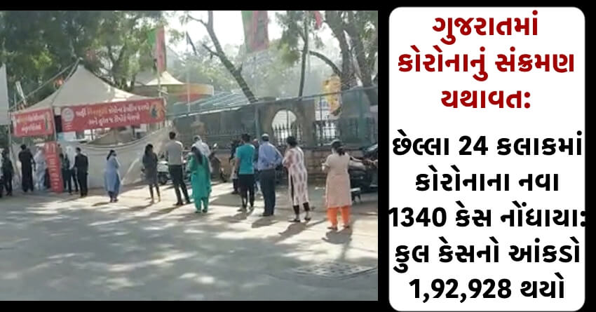 ગુજરાતમાં કોરોનાનું સંક્રમણ યથાવત: છેલ્લા 24 કલાકમાં કોરોનાના નવા 1340 કેસ નોંધાયા: કુલ કેસનો આંકડો 1,92,928 થયો