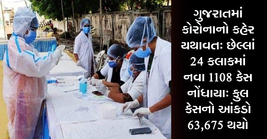 ગુજરાતમાં કોરોનાનો કહેર યથાવત: છેલ્લાં 24 કલાકમાં નવા 1108 કેસ નોંધાયા: કુલ કેસનો આંકડો 63,675 થયો