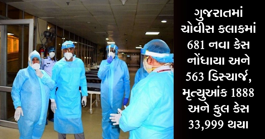 ગુજરાતમાં ચોવીસ કલાકમાં 681 નવા કેસ નોંધાયા અને 563 ડિસ્ચાર્જ, મૃત્યુઆંક 1888 અને કુલ કેસ 33,999 થયા