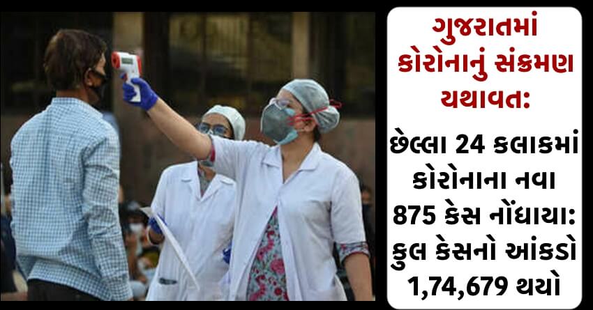 ગુજરાતમાં કોરોનાનું સંક્રમણ ઘટયું: છેલ્લા 24 કલાકમાં કોરોનાના નવા 875 કેસ નોંધાયા: કુલ કેસનો આંકડો 1,74,679 થયો