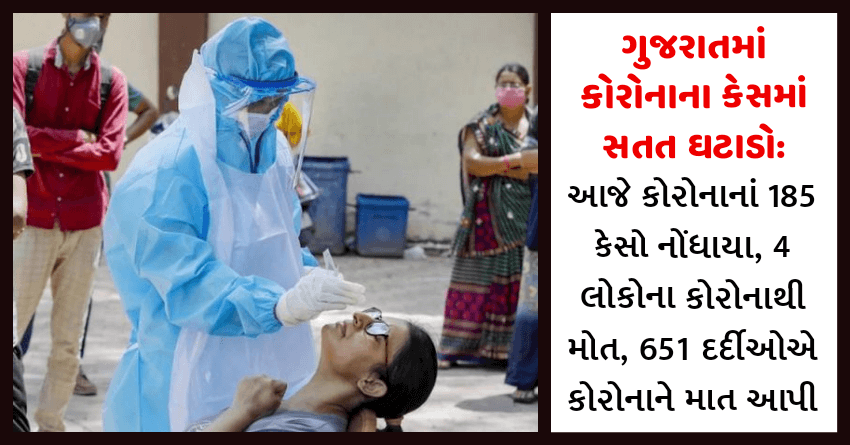 ગુજરાતમાં કોરોનાના કેસમાં સતત ઘટાડો: આજે કોરોનાનાં 185 કેસો નોંધાયા, 4 લોકોના કોરોનાથી મોત, 651 દર્દીઓએ કોરોનાને માત આપી