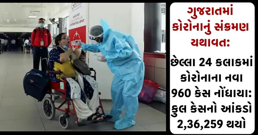 ગુજરાતમાં કોરોનાનું સંક્રમણ યથાવત: છેલ્લા 24 કલાકમાં કોરોનાના નવા 960 કેસ નોંધાયા: કુલ કેસનો આંકડો 2,36,259 થયો