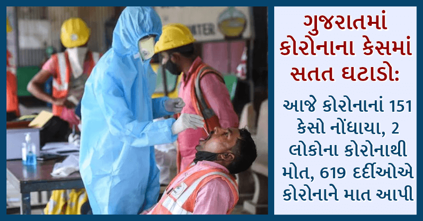 ગુજરાતમાં કોરોનાના કેસમાં સતત ઘટાડો: આજે કોરોનાનાં 151 કેસો નોંધાયા, 2 લોકોના કોરોનાથી મોત, 619 દર્દીઓએ કોરોનાને માત આપી