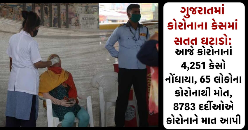ગુજરાતમાં કોરોનાના કેસમાં સતત ઘટાડો: આજે કોરોનાનાં 4,251 કેસો નોંધાયા, 65 લોકોના કોરોનાથી મોત, 8783 દર્દીઓએ કોરોનાને માત આપી