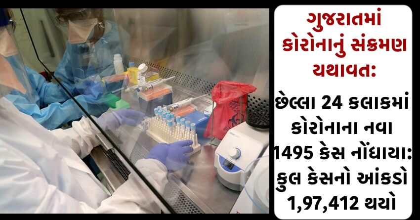 ગુજરાતમાં કોરોનાનું સંક્રમણ યથાવત: છેલ્લા 24 કલાકમાં કોરોનાના નવા 1495 કેસ નોંધાયા: કુલ કેસનો આંકડો 1,97,412 થયો