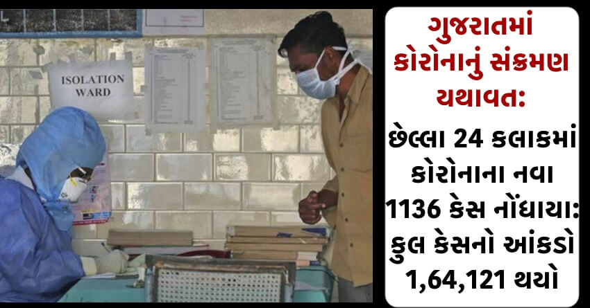 ગુજરાતમાં કોરોનાનું સંક્રમણ યથાવત: છેલ્લા 24 કલાકમાં કોરોનાના નવા 1136 કેસ નોંધાયા: કુલ કેસનો આંકડો 1,64,121 થયો
