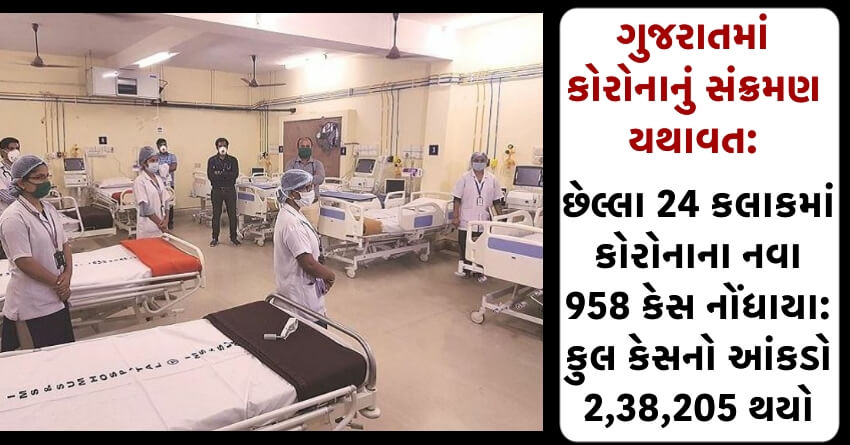 ગુજરાતમાં કોરોનાનું સંક્રમણ યથાવત: છેલ્લા 24 કલાકમાં કોરોનાના નવા 958 કેસ નોંધાયા: કુલ કેસનો આંકડો 2,38,205 થયો
