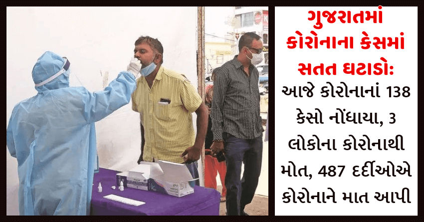 ગુજરાતમાં કોરોનાના કેસમાં સતત ઘટાડો: આજે કોરોનાનાં 138 કેસો નોંધાયા, 3 લોકોના કોરોનાથી મોત, 487 દર્દીઓએ કોરોનાને માત આપી