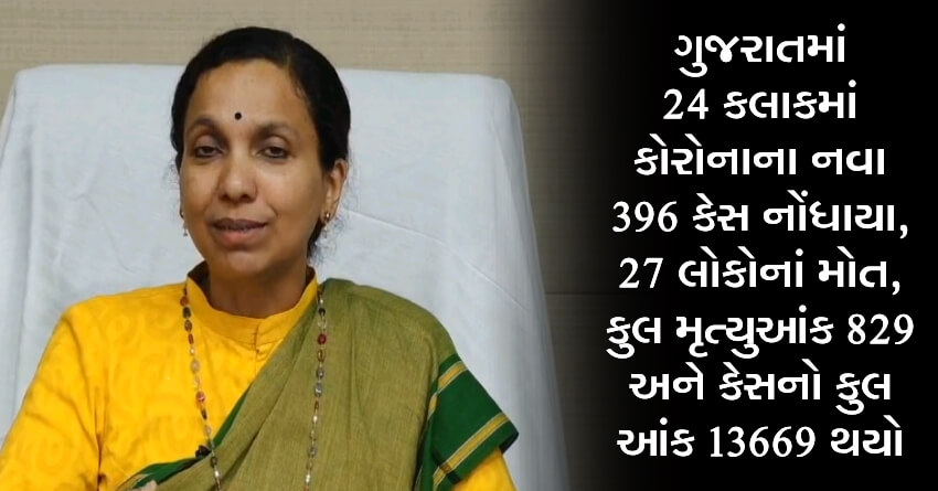 ગુજરાતમાં 24 કલાકમાં કોરોનાના નવા 396 કેસ નોંધાયા, 27 લોકોનાં મોત, કુલ મૃત્યુઆંક 829 અને કેસનો કુલ આંક 13669 થયો