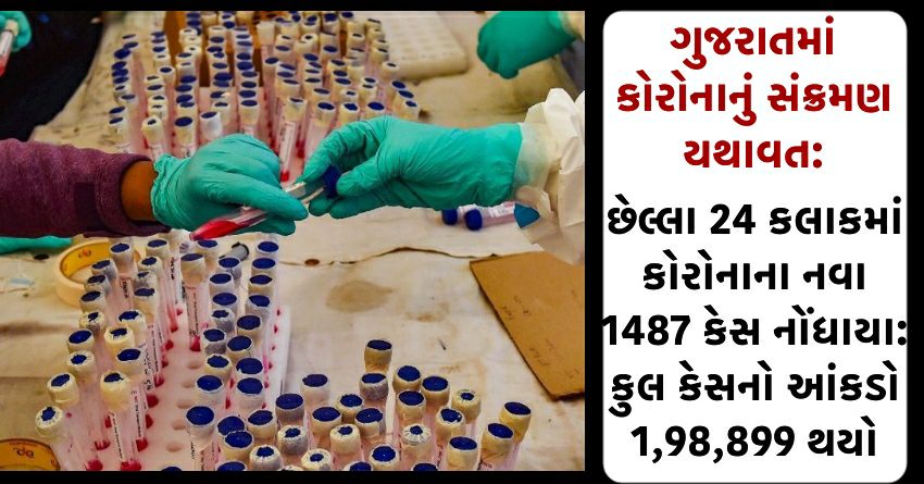 ગુજરાતમાં કોરોનાનું સંક્રમણ યથાવત: છેલ્લા 24 કલાકમાં કોરોનાના નવા 1487 કેસ નોંધાયા: કુલ કેસનો આંકડો 1,98,899 થયો
