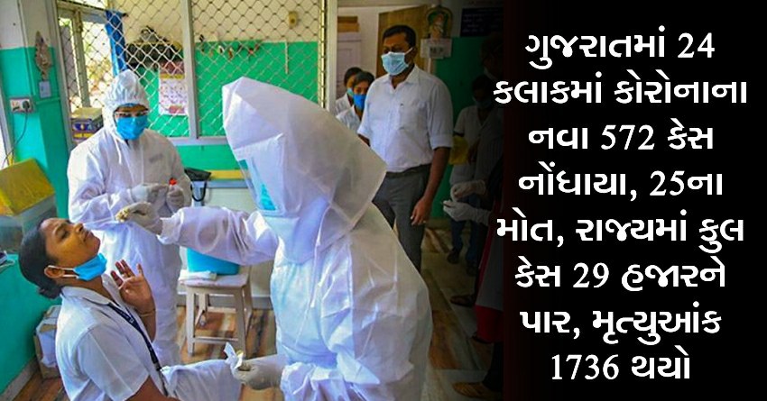 ગુજરાતમાં 24 કલાકમાં કોરોનાના નવા 572 કેસ નોંધાયા, 25ના મોત, રાજ્યમાં કુલ કેસ 29 હજારને પાર, મૃત્યુઆંક 1736 થયો