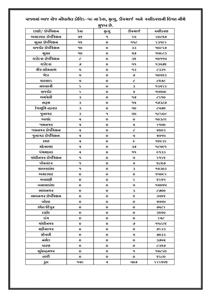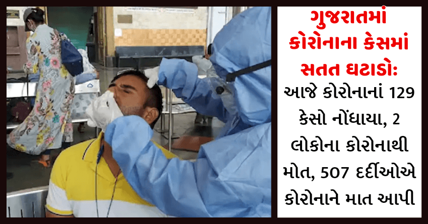 ગુજરાતમાં કોરોનાના કેસમાં સતત ઘટાડો: આજે કોરોનાનાં 129 કેસો નોંધાયા, 2 લોકોના કોરોનાથી મોત, 507 દર્દીઓએ કોરોનાને માત આપી
