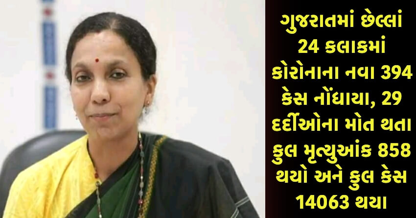 ગુજરાતમાં છેલ્લાં 24 કલાકમાં કોરોનાના નવા 394 કેસ નોંધાયા, 29 દર્દીઓના મોત થતા કુલ મૃત્યુઆંક 858 થયો અને કુલ કેસ 14063 થયા