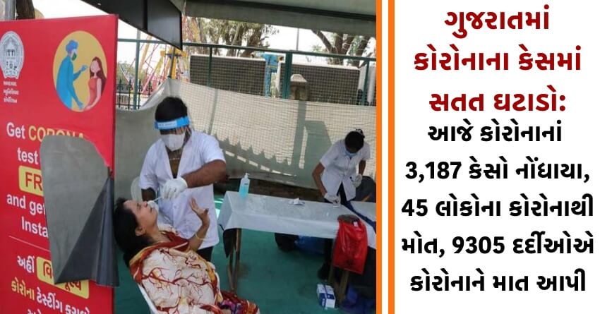 ગુજરાતમાં કોરોનાના કેસમાં સતત ઘટાડો: આજે કોરોનાનાં 3,187 કેસો નોંધાયા, 45 લોકોના કોરોનાથી મોત, 9305 દર્દીઓએ કોરોનાને માત આપી