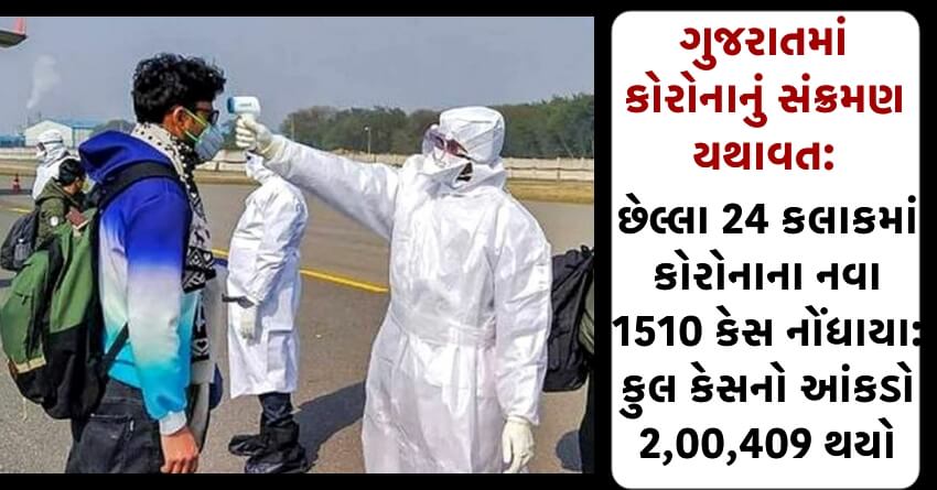 ગુજરાતમાં કોરોનાનું સંક્રમણ યથાવત: છેલ્લા 24 કલાકમાં કોરોનાના નવા 1510 કેસ નોંધાયા: કુલ કેસનો આંકડો 2,00,409 થયો