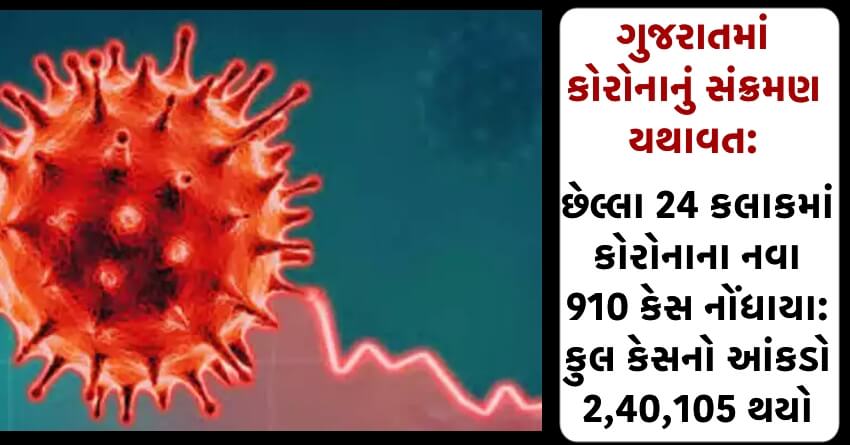 ગુજરાતમાં કોરોનાનું સંક્રમણ યથાવત: છેલ્લા 24 કલાકમાં કોરોનાના નવા 910 કેસ નોંધાયા: કુલ કેસનો આંકડો 2,40,105 થયો