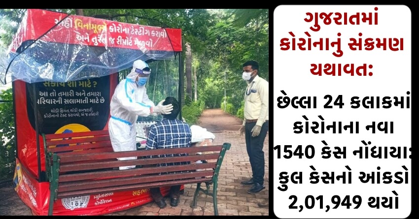 ગુજરાતમાં કોરોનાનું સંક્રમણ યથાવત: છેલ્લા 24 કલાકમાં કોરોનાના નવા 1540 કેસ નોંધાયા: કુલ કેસનો આંકડો 2,01,949 થયો