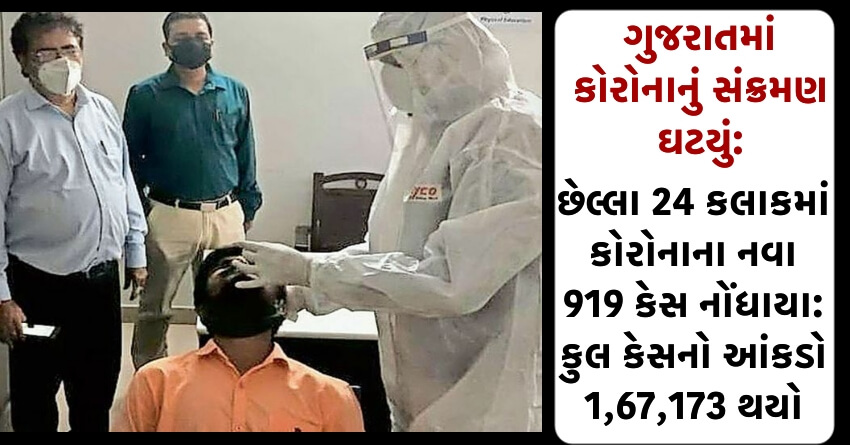 ગુજરાતમાં કોરોનાનું સંક્રમણ યથાવત: છેલ્લા 24 કલાકમાં કોરોનાના નવા 919 કેસ નોંધાયા: કુલ કેસનો આંકડો 1,67,173 થયો