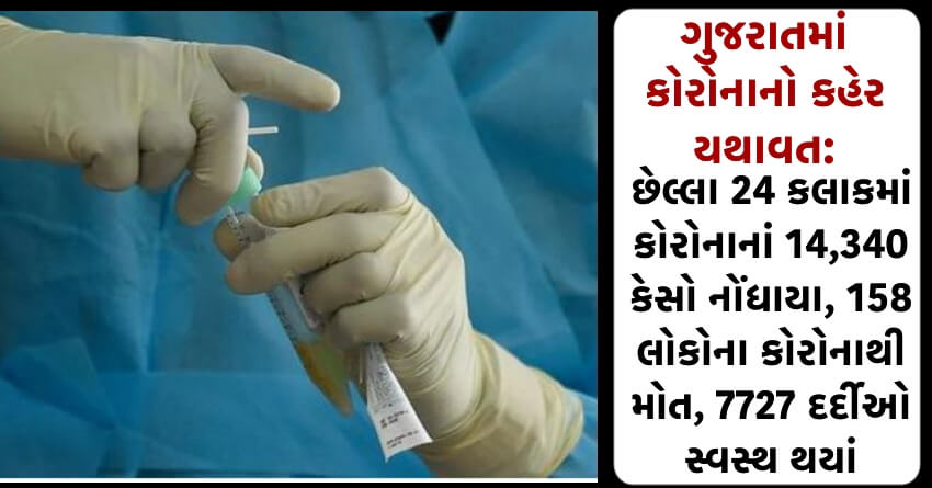 ગુજરાતમાં કોરોનાનો કહેર યથાવત: છેલ્લા 24 કલાકમાં કોરોનાનાં 14,340 કેસો નોંધાયા, 158 લોકોના કોરોનાથી મોત, 7727 દર્દીઓ સ્વસ્થ થયાં