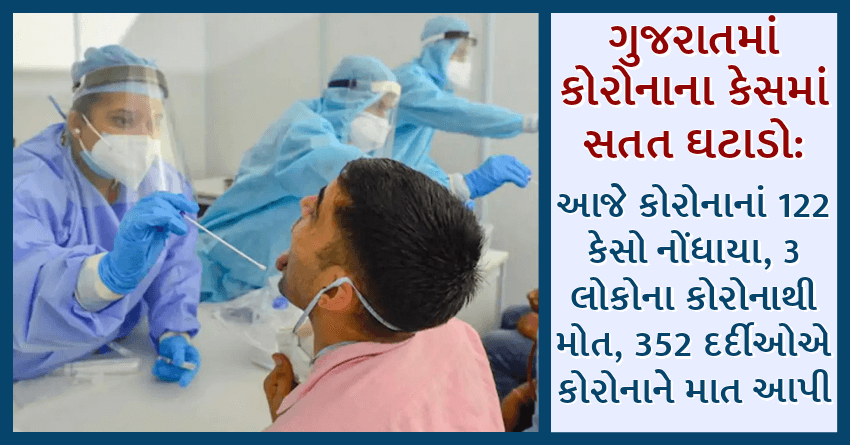 ગુજરાતમાં કોરોનાના કેસમાં સતત ઘટાડો: આજે કોરોનાનાં 122 કેસો નોંધાયા, 3 લોકોના કોરોનાથી મોત, 352 દર્દીઓએ કોરોનાને માત આપી