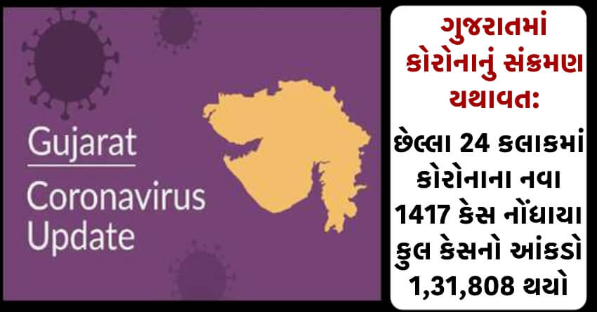 ગુજરાતમાં કોરોનાનું સંક્રમણ યથાવત: છેલ્લા 24 કલાકમાં કોરોનાના નવા 1417 કેસ નોંધાયા: કુલ કેસનો આંકડો 1,31,808 થયો