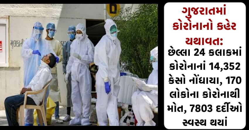 ગુજરાતમાં કોરોનાનો કહેર યથાવત: છેલ્લા 24 કલાકમાં કોરોનાનાં 14,352 કેસો નોંધાયા, 170 લોકોના કોરોનાથી મોત, 7803 દર્દીઓ સ્વસ્થ થયાં
