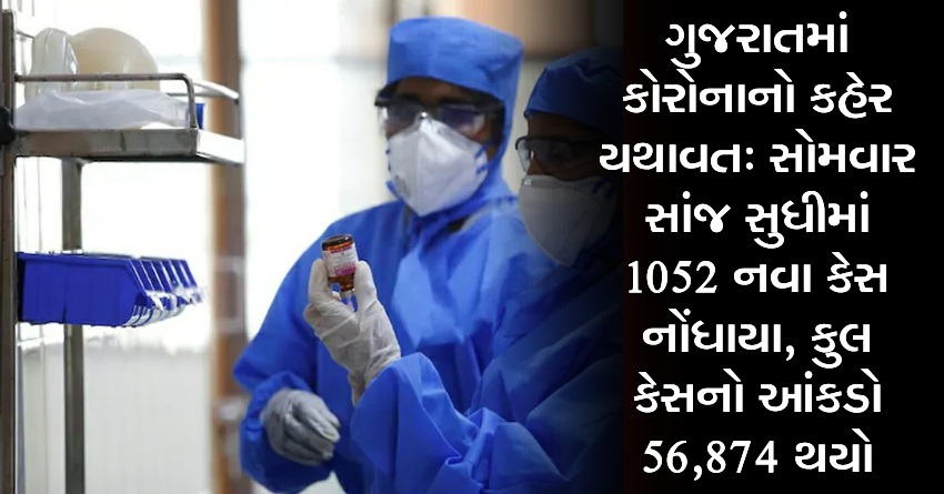 ગુજરાતમાં કોરોનાનો કહેર યથાવત: સોમવાર સાંજ સુધીમાં 1052 નવા કેસ નોંધાયા, કુલ કેસનો આંકડો 56,874 અને મૃત્યુઆંક 2348 થયો