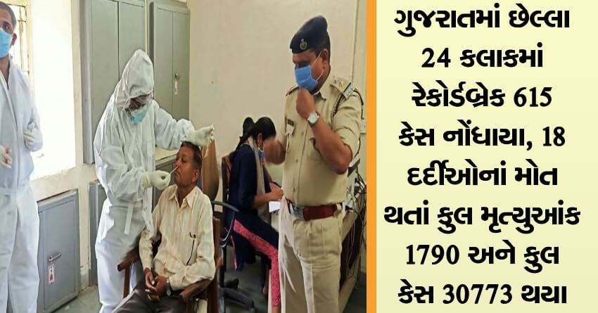 ગુજરાતમાં છેલ્લા 24 કલાકમાં રેકોર્ડબ્રેક 615 કેસ નોંધાયા, 18 દર્દીઓનાં મોત થતાં કુલ મૃત્યુઆંક 1790 અને કુલ કેસ 30773 થયા