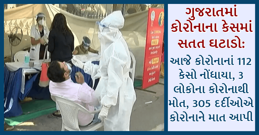 ગુજરાતમાં કોરોનાના કેસમાં સતત ઘટાડો: આજે કોરોનાનાં 112 કેસો નોંધાયા, 3 લોકોના કોરોનાથી મોત, 305 દર્દીઓએ કોરોનાને માત આપી