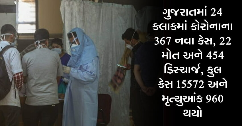 ગુજરાતમાં 24 કલાકમાં કોરોનાના 367 નવા કેસ, 22 મોત અને 454 ડિસ્ચાર્જ, કુલ કેસ 15572 અને મૃત્યુઆંક 960 થયો