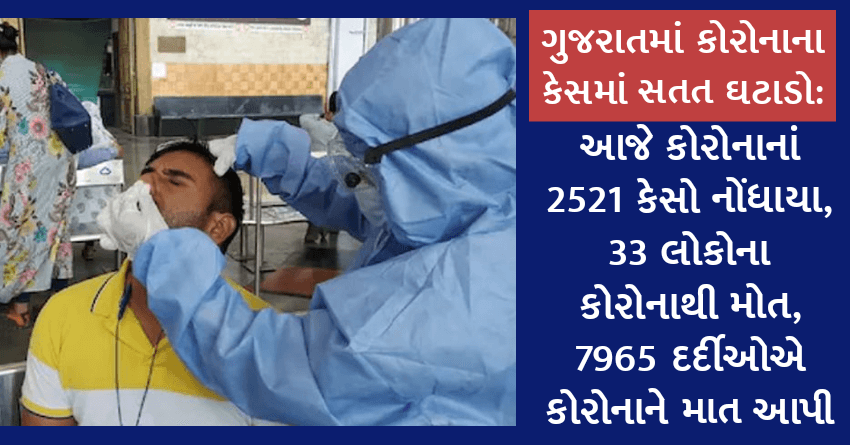 ગુજરાતમાં કોરોનાના કેસમાં સતત ઘટાડો: આજે કોરોનાનાં 2521 કેસો નોંધાયા, 33 લોકોના કોરોનાથી મોત, 7965 દર્દીઓએ કોરોનાને માત આપી