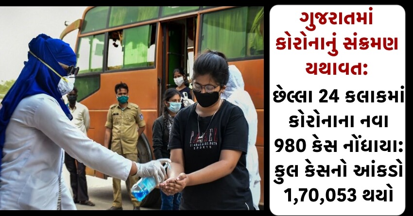 ગુજરાતમાં કોરોનાનું સંક્રમણ યથાવત: છેલ્લા 24 કલાકમાં કોરોનાના નવા 980 કેસ નોંધાયા: કુલ કેસનો આંકડો 1,70,053 થયો