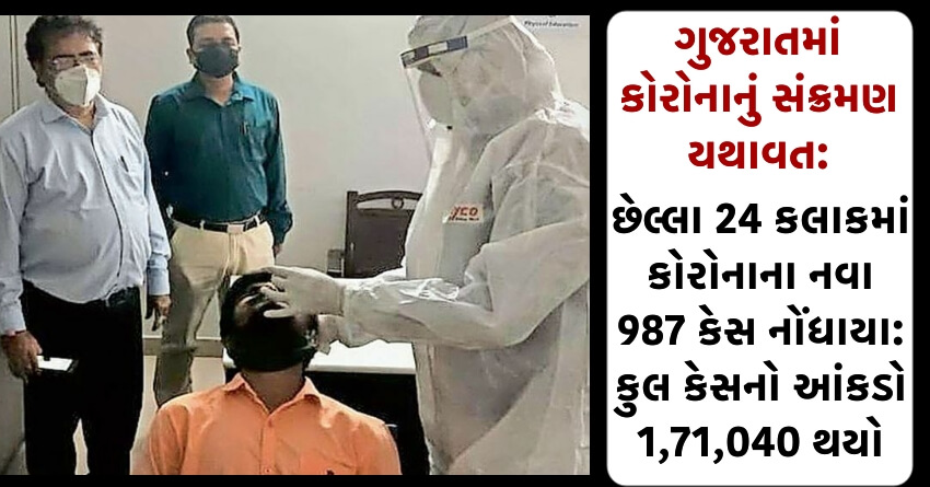 ગુજરાતમાં કોરોનાનું સંક્રમણ યથાવત: છેલ્લા 24 કલાકમાં કોરોનાના નવા 987 કેસ નોંધાયા: કુલ કેસનો આંકડો 1,71,040 થયો